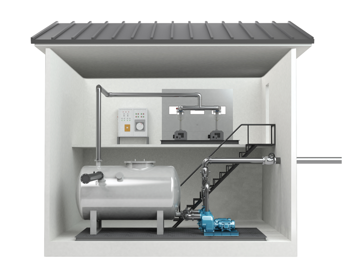 Die zentrale Vakuumstation bildet das Herzstück jedes Vakuumnetzes. Ihre Hauptkomponenten sind der Abwassersammeltank, die Abwasserpumpen und natürlich die Vakuumpumpen. Sie erzeugen den erforderlichen Unterdruck im System – ungefähr -0.6 bar. Roediger® Vakuumstationen gibt es in allen erdenklichen Größen – von der standardisierten Kompaktanlage für wenige Nutzer bis hin zu kundenspezifischen Großanlagen für mehrere tausend Wohneinheiten.